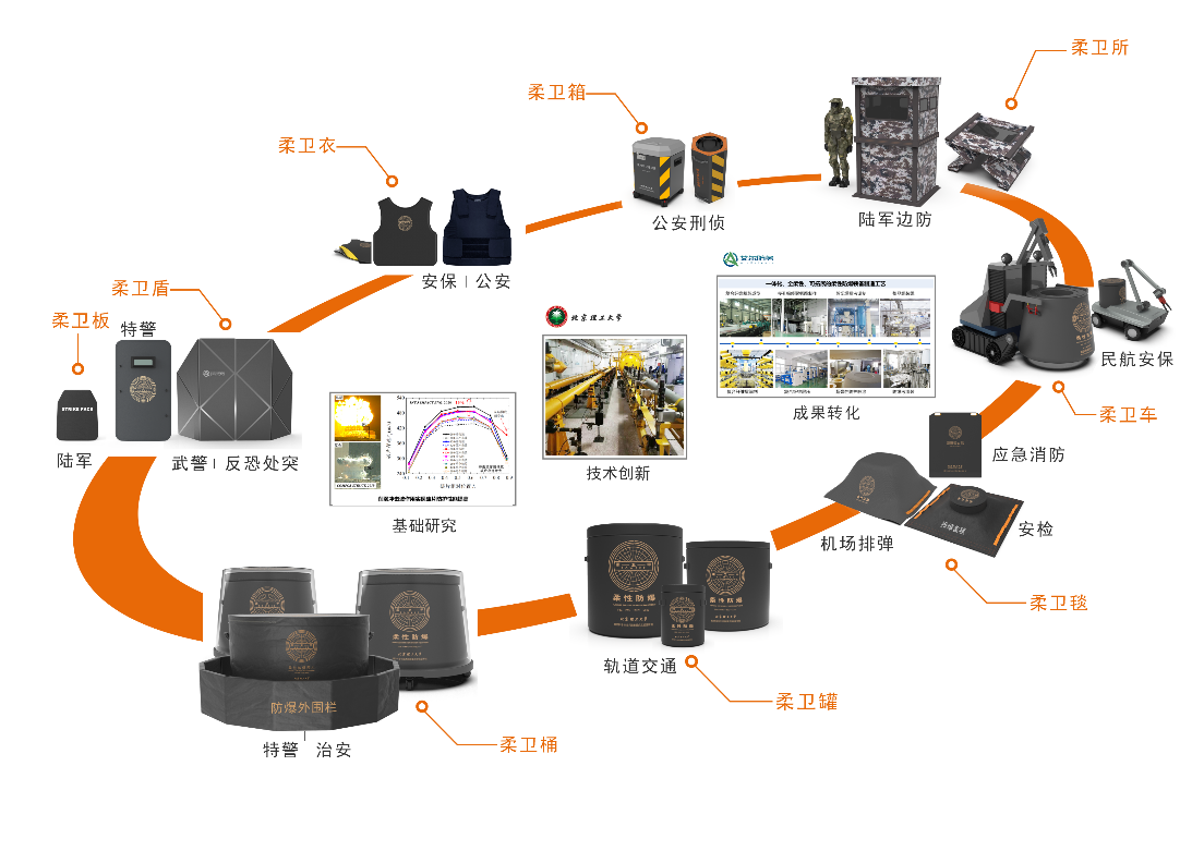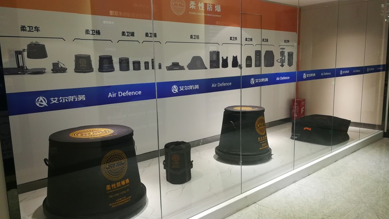 目前艾尔防务在北京、长沙、重庆等多个城市开展柔性防爆材料与技术产业化转化工作,并以“柔卫甲”为核心防爆品牌,研发出一系列具有重量轻、携行方便、使用灵活、无二次伤害等特点的柔性防爆产品,被国家相关部委鉴定为“填补国内外空白,技术国际领先”。