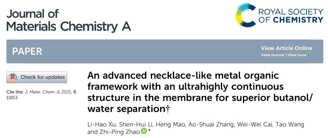 近日,北京理工大学化学与化工学院博士生徐李昊以第一作者身份在国际顶级期刊Journal of Materials Chemistry A上发表题目为“An advanced necklace-like metal organic framework with an ultrahighly continuous structure in the membrane for superior butanol/water separation”的研究论文。北京理工大学为唯一通讯单位,化学与化工学院先进功能膜与膜过程团队赵之平教授为通讯录作者。本研究得到国家自然科学基金重点项目(21736001)资助。