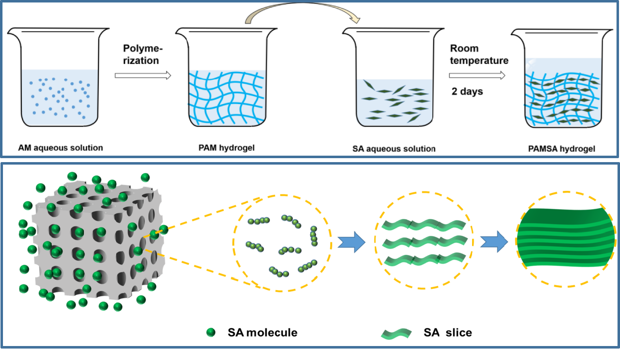 近日,北京理工大学生命学院绿色生物制造课题组通过海藻酸盐的原位多层自组装技术,结合具有丰富羟基作用位点的聚丙烯酰胺,用简易方法构建出具有规整层结构的高强度自愈合水凝胶。系统的表征揭示了动态氢键作用对海藻酸钠(SA)在多孔聚丙烯酰胺(PAM)基质中自组装成层状结构的驱动机理。此外,氢键在增强水凝胶的自愈合作用方面也发挥着关键作用,水凝胶自愈合能力达99%。同时,这种有序层结构也使海藻酸盐基水凝胶的拉伸强度达到了266 kPa。上述工作为研发具有有序多层结构的高机械强度和自愈合性能水凝胶提供了新思路和方法,并有助于实现水凝胶功能的多样性。