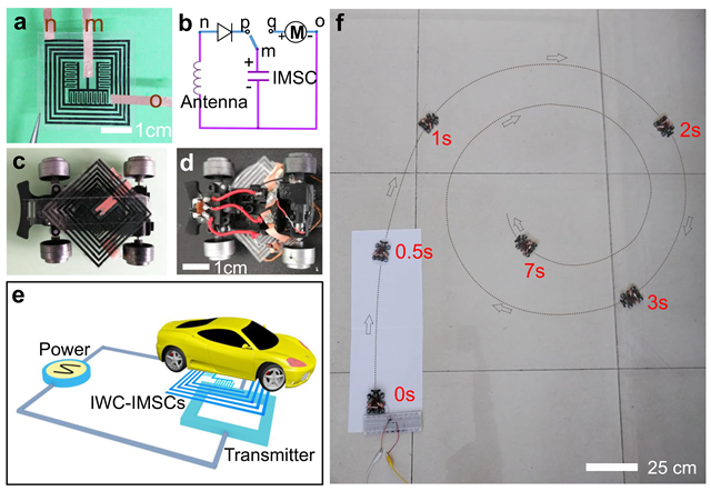 最后,将一体化器件与电动玩具车进行组装后放置在无线发射器附近,通过自身的无线线圈进行无线充电。经无线充电6分钟后, 一体化器件的总能量和功率输出分别达0.18 mWh和45.9 mW,拨动开关释放电容器中存储的能量可立即驱动电动玩具车奔跑(图5)。该研究为非接触式微电子学和柔性微型机器人的研究带来了新思路,有望推动便携式微型电子器件的发展。