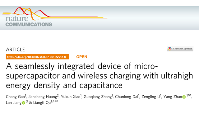 近日,北京理工大学化学与化工学院博士生高畅以第一作者身份在Nature Communications期刊发表题目为“A seamlessly integrated device of micro-supercapacitor and wireless charging with ultrahigh energy density and capacitance”的研究论文,于2021年5月11日在线发表,论文链接:https://www.nature.com/articles/s41467-021-22912-8。北京理工大学为第一通讯单位,北京理工大学化学与化工学院赵扬特别研究员和清华大学化学系曲良体教授为共同通讯作者,北京理工大学机械与车辆学院姜澜教授为本研究的合作者。本研究得到了国家重点研发计划项目、国家自然科学基金和北京市自然科学基项目等支持。