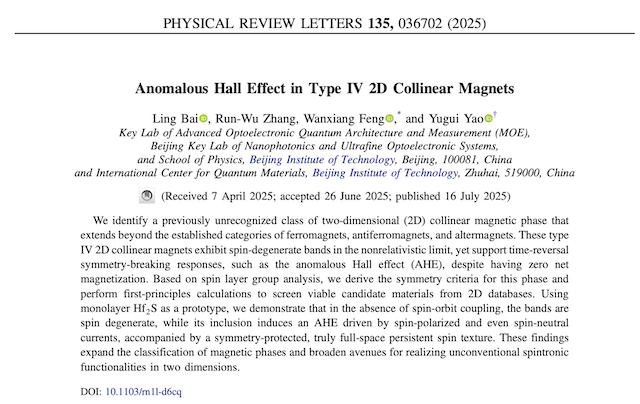 北京理工大学团队在二维共线磁体的分类和反常输...2025-07-17 -
