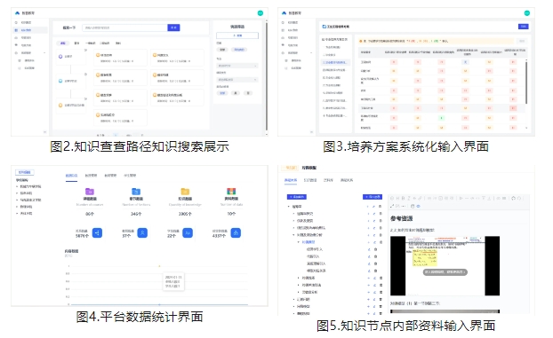 本项目自主开发了教育知识图谱构建与服务平台,支持知识图谱的“建设、服务、规划、开放”四个主要功能。在平台的支撑下,以专业建设视角打通了从培养目标、课程体系、知识点、知识资源的链条,跨课程多维度关联形成了知识网络,实现教师、学生、知识、教材等的一体化集成,支撑专业培养方案定制、个性化学习、新形态教材建设。