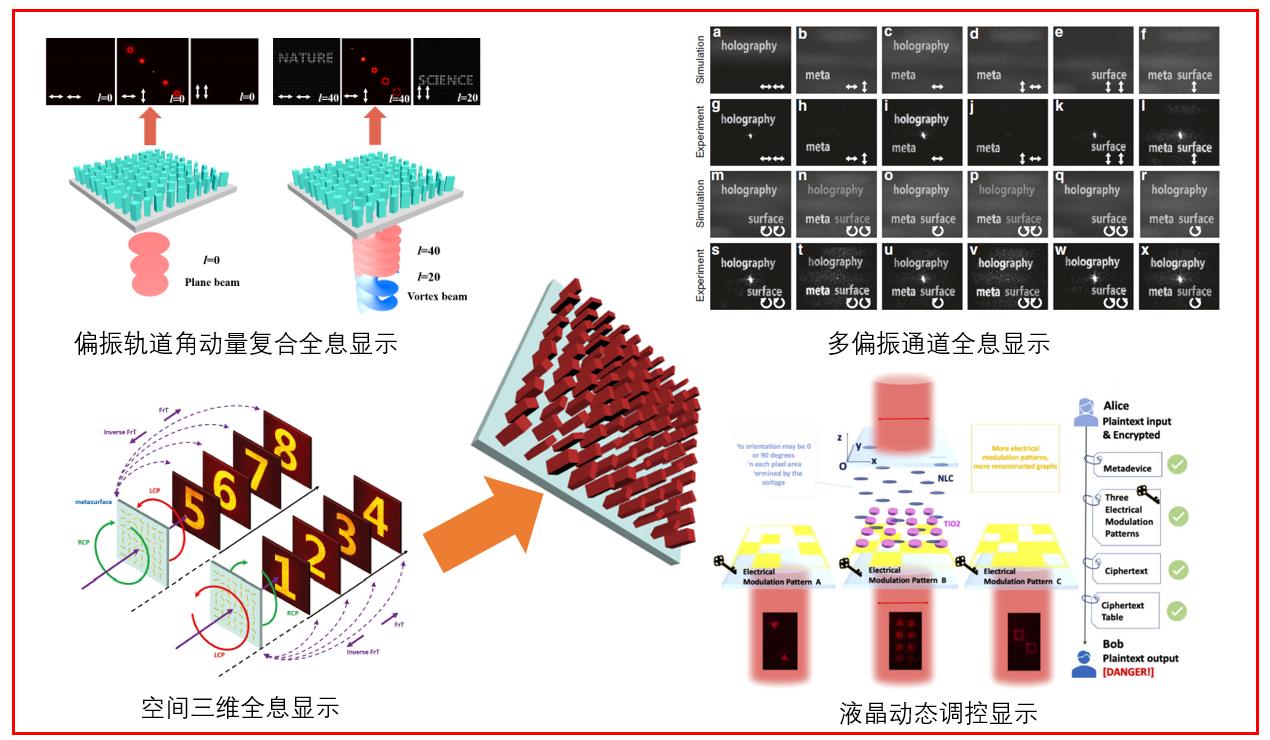基于超颖表面的多维信息显示技术的体积小,构造灵活多样,结构特征明显,能够复用多种光学特性,为信息显示,特别是全息显示领域到了创新性变革。因其能够彻底摆脱传统光学的限制,提高信息容量和显示多样性。该技术可在微纳量级达到成像和显示的极佳效果,有望在数据存储,超分辨率显示,光学加密,增强现实,智能设备等领域发挥能以想象的优势。