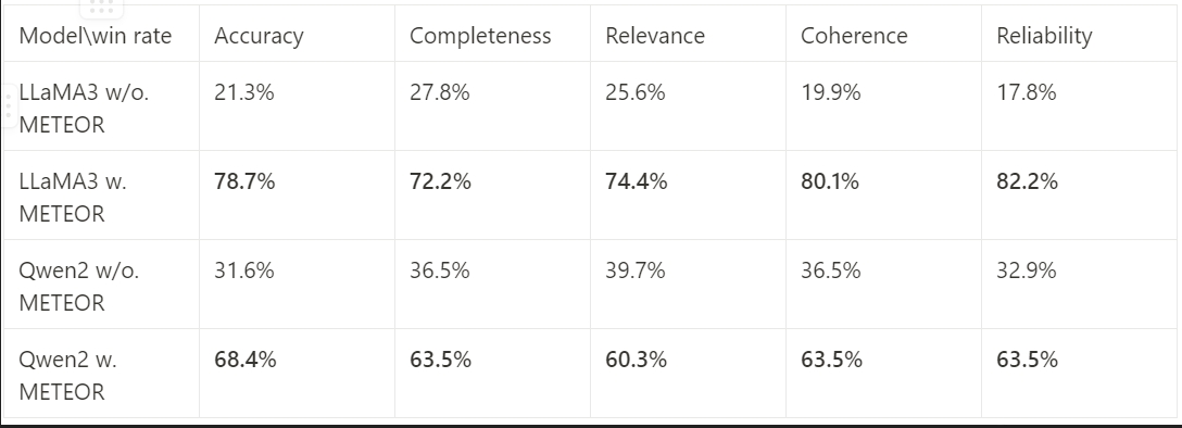 对比了应用进化方法(METEOR)后大模型前后各维度的性能变化。在准确性、完整性、相关性、连贯性和可靠性方面,可以使得任意开源基座模型的性能提高50%,甚至更高(如下图所示,LLaMA3-8B-Instruct和Qwen2-7B-Instruct性能取得了显著提升)。