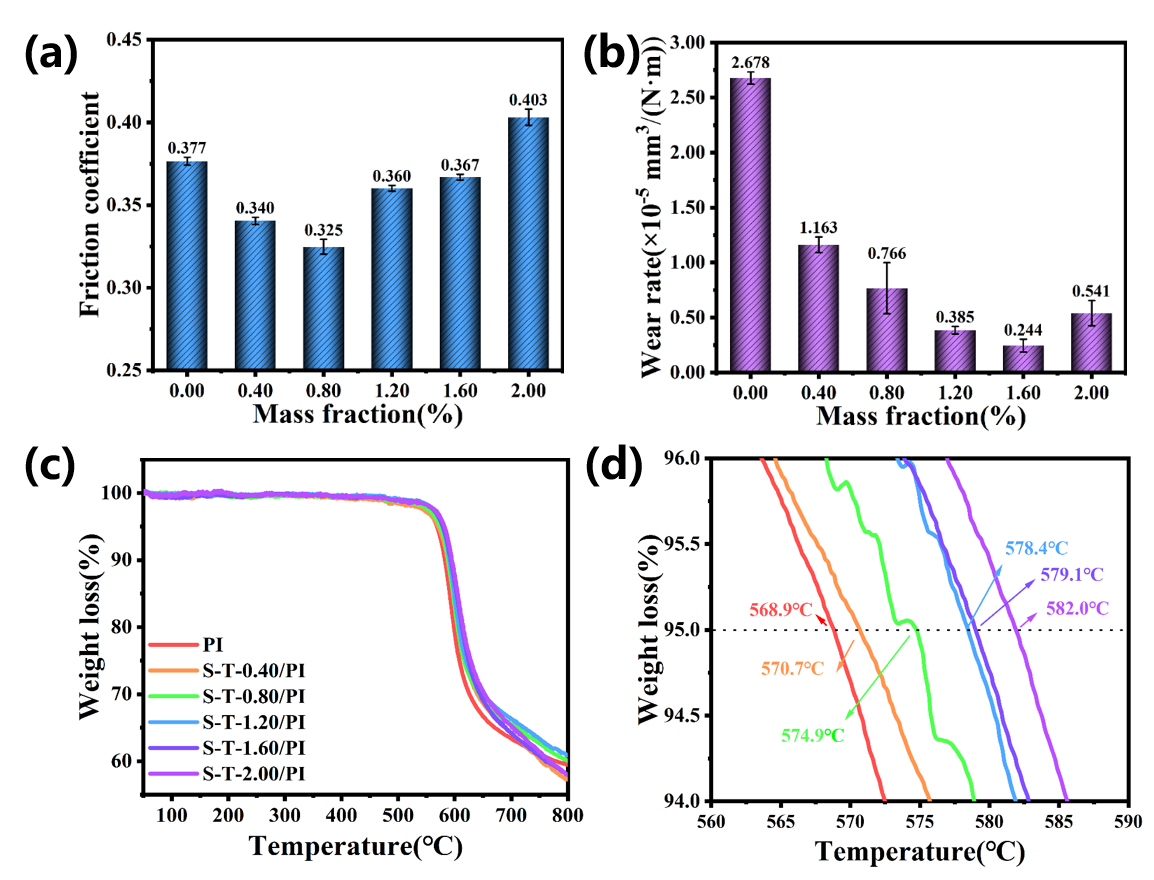 图3.复合材料的摩擦系数、磨损率及热失重曲线