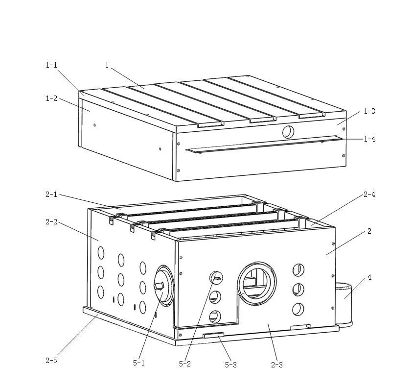 设计包括箱盖、箱体、巢脾框、饲喂槽、挡门塞,箱盖盖板上面布置有灯光槽,下面分布着摄像头固定装置,分别可从垂直和45度倾斜角度实时观察记录箱体内部情况;底板与带迷宫底板根据具体需求交替使用,底板上布置有玻璃饲养箱互通口。其中带互通口的底板在使用时可与玻璃饲养箱配合使用,并使二者保持互通,可以有效保证实验蜂箱的清洁性。带迷宫底板可用来观察蜜蜂的群居特性。箱盖盖板上面布置的灯光槽内可安装灯带,为箱内环境和摄像头监控提供良好照明条件。