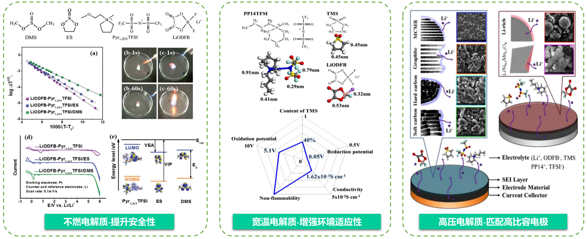 在能源绿色低碳转型背景下,加速动力系统电动化、储能装置电气化成为推动能源革命发展的必然趋势。锂电池作为当前最为成熟、发展最快的新型储能技术之一,其安全隐患随着能量密度的提升日益凸显,频发自燃、爆炸等热失控现象导致的安全事故,严重制约了电化学储能的进一步推广与应用。构筑高安全的电池体系,已成为当前锂电池研究的重中之重。本成果以增强电池本质安全性角度出发,基于环链协同效应、自适应机制理论,研制出系列热稳定、 阻燃型、宽温域等功能电解质材料。