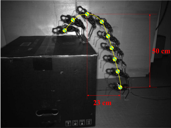 跳跃或飞翔等运动形式,可以获得远高于传统行走、爬行步态的运动灵活性,为使机器人具有小尺度、高集成、多模态的特点,本项目在国内首次提出“跃翔一体”的机器人设计理念,创新性将跳跃结构与固定翼飞行思路结合,集飞行模块、驱动模块与仿生弹跳腿于一体。研制的原理样机在微小尺度下实现了5倍体长的跳跃高度(0.5m)的同时,可在空中维持良好姿态、滑翔距离达到了50倍体长(5m)。