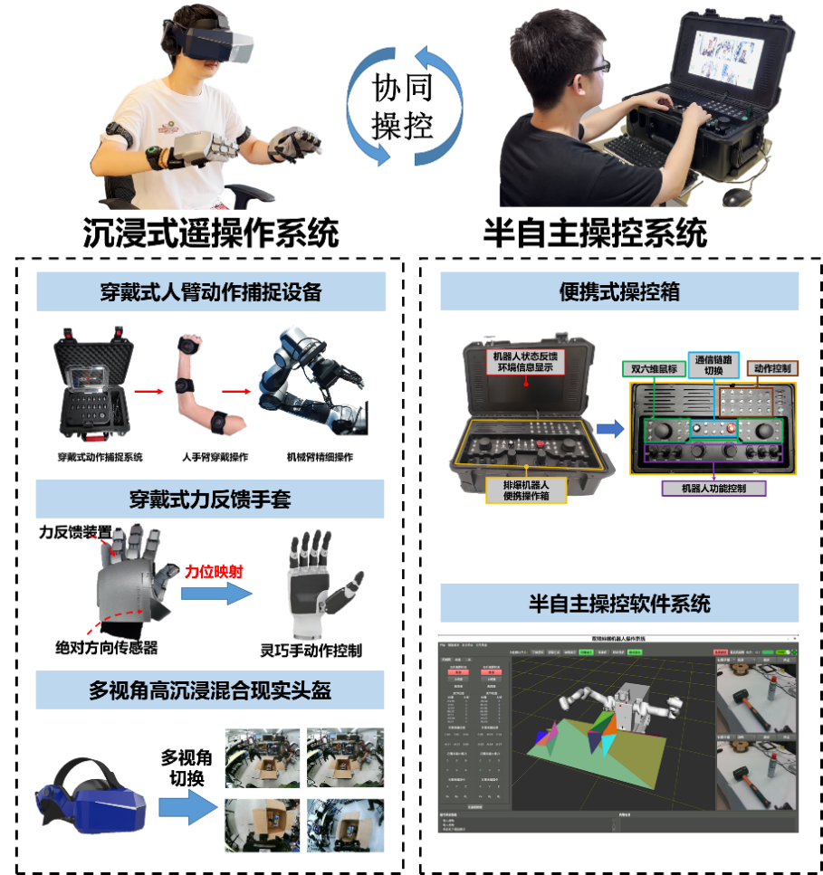 双臂排爆机器人可通过人在回路沉浸式和半自主软件辅助操作系统进行协同远程操作(图2),能够实现沉浸式安全灵巧搜排爆作业。