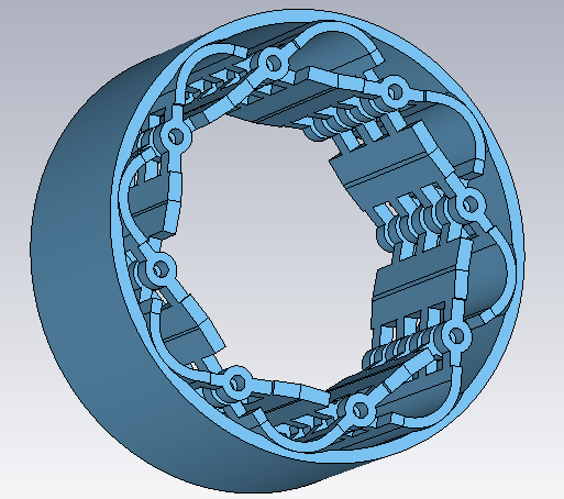 该结构具有多次防护功能,将外壳套设在吸能芯子的外周(如图1),将组装好的吸能结构安装于待吸能的设备上,当设备发生碰撞,外壳在外力的作用下发生形变进行吸能,吸能芯子受到外壳的作用力发生形变,与外壳的形变叠加吸能。该吸能结构,既能够将吸能芯子与外壳装配在一起使用,用于交通工具(如汽车)的防撞,可承受多次碰撞;也能够单独使用吸能芯子,如将吸能芯子设在复合材料(如泡沫轴)的内部,即吸能芯子作为泡沫轴的芯子,与刚性内轴的泡沫轴相比,由于吸能芯子形变能够提供额外(泡沫轴自身的形变也产生吸能效果)的吸能效果,增强了泡沫轴的吸能效果,进而与人体产生更多的相互作用,促进人体肌肉及骨骼组织的运动后恢复。该结构既可以与刚性外壳的形变与反弹作用结合增强吸能效果,也可以与软性材料的可回弹形变结合增强吸能效果。该吸能结构的材质由金属或高分子聚合物组成。考虑到吸能芯子由于具有连续交错的剪刀形合页结构,使用传统铸造式成型技术较难实现,使用机械加工方式实现难度也较大,形变单元采用3D打印的方式制作。