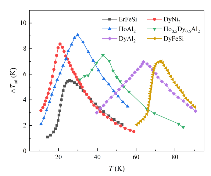 图1.液氢温区常用的几种磁热材料及其绝热温变