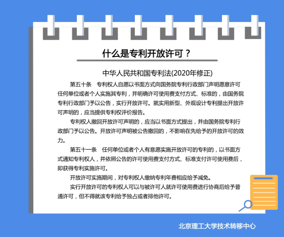 为积极落实国家知识产权局、北京市知识产权局专利开放许可试点实施方案,进一步提升专利转化成效,近日,北京理工大学技术转移中心会同相关部门组织开展了专利开放许可项目集中征集和备案工作。日前,共征集遴选到专利51项,涉及新材料、新一代信息技术、新能源和节能环保、医疗健康等多个领域,具有良好的市场前景和较强的实用性,已作为学校首批开放许可专利提交至知识产权部门备案,将通过专利开放许可平台面向社会集中发布。