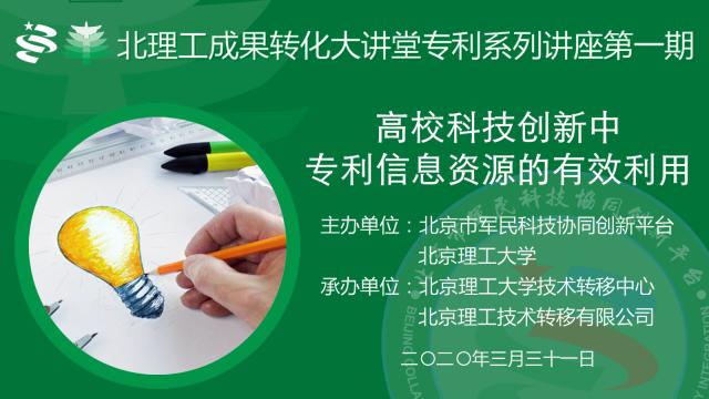 2020年3月31日上午,由北京理工大学技术转移中心策划、依托北京市军民科技协同创新平台实施的北理工“成果转化大讲堂”——专利系列讲座正式开讲。首场讲座通过线上平台举行,以“高校科技创新中专利信息资源的有效利用”为主题,邀请曾负责知名上市公司知识产权管理工作的资深知识产权专家周同担任主讲。来自校内外的300多位科技工作者参加了活动。