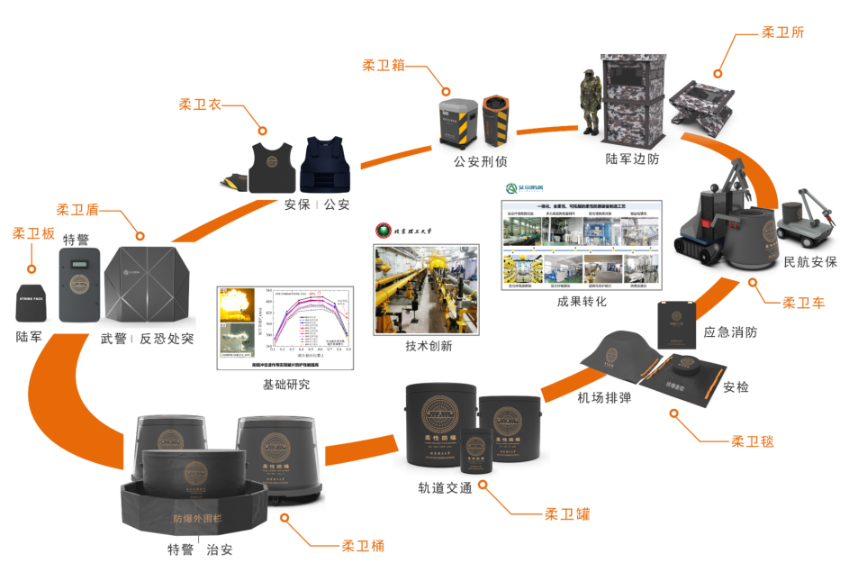 作为北京理工大学重点培育的学科性公司,艾尔防务与北理工形成从基础科研、技术开发到成果转化、产业发展的全链条联合创新体,面向军事安全、社会安全和公共安全等国家安全重大需求持续创新,已成功将“柔性复合防爆技术”推广应用到“防爆安检、人员防护、工程抗爆、新能源安全、应急防护、作战保障”等六大领域,取得显著经济社会效益,如其中“柔性防爆罐”单个产品新增的直接经济效益就已超过3亿元。