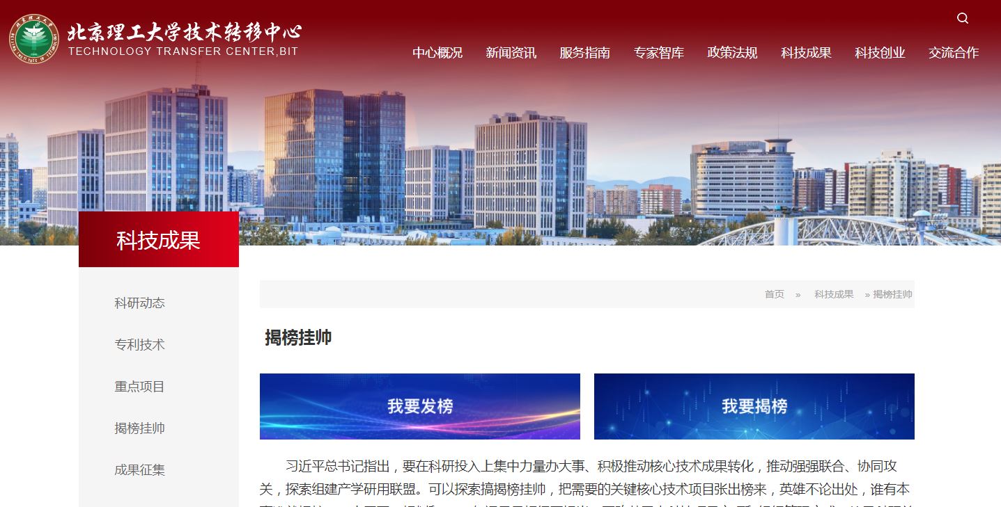 为积极响应国家号召,进一步发挥我校科技和人才优势,更好地主动对接和深度服务产业发展需求,促进更多科技成果实现转化落地,技术转移中心以中心网站已有的“科技成果转化综合服务平台&技术转移中心信息交互平台”为基础,搭建了以促进技术供需对接和科技成果转化为主要目的的“揭榜挂帅”平台。