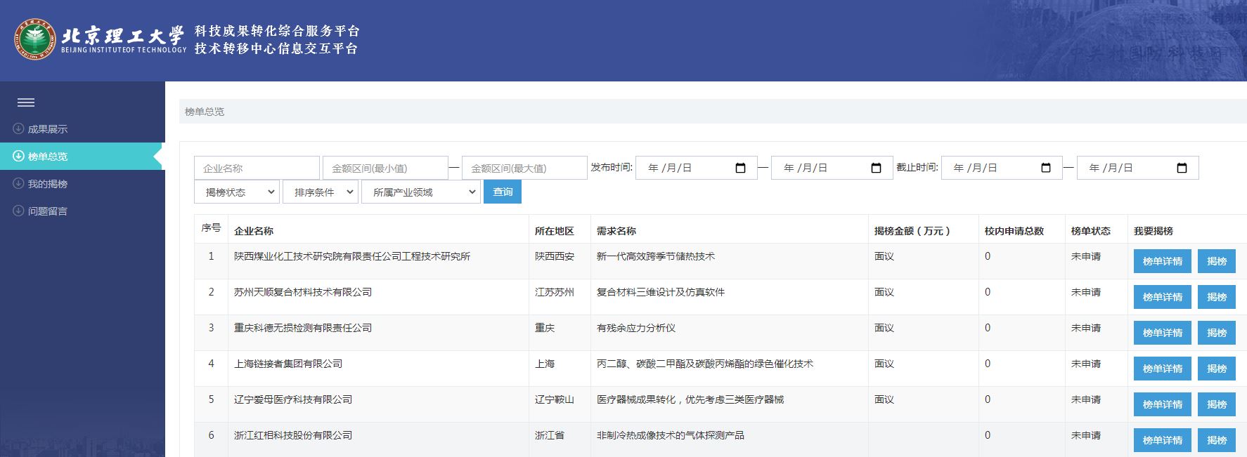 需求榜单可进行检索查询。榜单状态为“未揭榜”的,学校师生可以通过点击 “我要揭榜”按钮申请揭榜,获得需求方信息,并通过技术转移中心与需求方进行进一步沟通。个人已申请揭榜的榜单状态变更为“已申请”,网站将提示 “校内申请总数”。